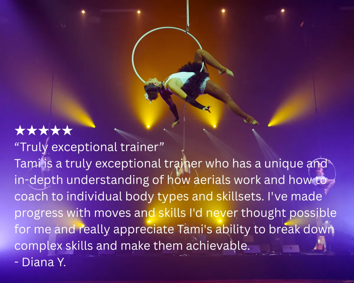 Train with award winning, internationally recognised aerial coach with over 20+ years experience and 2000+ students coached. Tami's physiotherapy-informed approach ensures you progress safely, master new skills, and find your unique aerial style.